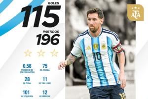 梅西國家隊(duì)生涯196場(chǎng)打進(jìn)115球,仍居國家隊(duì)歷史射手榜第二,榜首C羅143球。