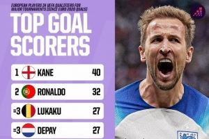 體育資訊11月17日訊 Opta統(tǒng)計(jì)了球員在近4屆歐洲杯預(yù)選賽、世預(yù)賽歐洲區(qū)比賽的進(jìn)球數(shù)量,并列出榜單,凱恩40球居首。