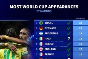 各國參加世界杯次數(shù):巴西23次最多,德國21次、阿根廷19次前三