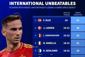 體育資訊11月20日訊 德國轉(zhuǎn)會市場統(tǒng)計了本世紀球員國家隊首秀之后的連續(xù)不敗場次數(shù)據(jù),并列出榜單,法比安·魯伊斯連續(xù)41場不敗居首。