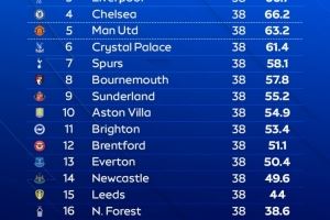 天空體育預(yù)測(cè)本賽季英超最終排名(積分為模擬10萬次的平均值)