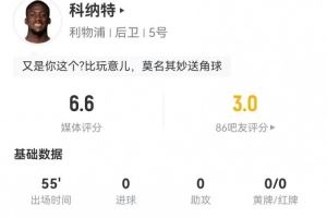 體育資訊11月23日訊 利物浦在本輪英超0-3落后諾丁漢森林,科納特本場數(shù)據(jù)如下: