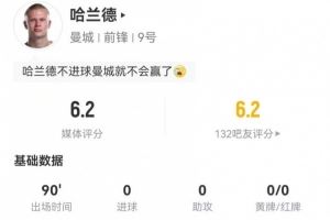迷失!哈蘭德本場(chǎng)5射2正+3次錯(cuò)失良機(jī) 11對(duì)抗6成功 僅獲6.2分