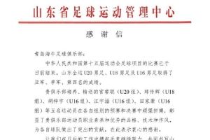 山東省足管中心:感謝青島海牛輸送的5名球員對(duì)山東男足的貢獻(xiàn)