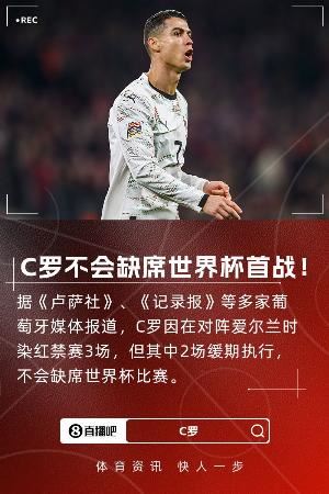 體育資訊11月27日訊 C羅在對陣愛爾蘭的比賽中被直紅罰下,國際足聯(lián)對他禁賽三場,但兩場緩期執(zhí)行。因此,C羅不會缺席世界杯比賽。